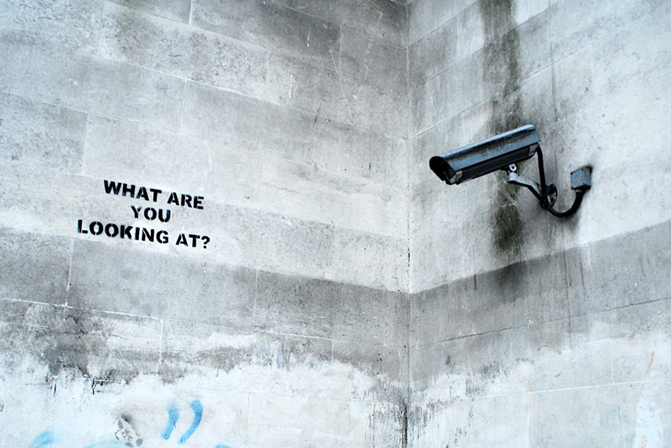 Het hele boek deed me enorm denken aan het bovenstaande werk van straatkunstenaar Banksy. Banksy is iemand die me al enkele jaren enorm inspireert omwille van zijn maatschappijkritische werken. In Engeland heb je het telecombedrijf ‘CCTV’ dat camera’s plaatst doorheen heel Engeland om de veiligheid van de inwoners te garanderen. Niet iedereen is hier, terecht, even hard mee gediend omdat de mensen geen privacy meer hebben. Dat omschrijft de titel ook. Mensen hebben het gevoel dat er maatregelen moeten genomen worden om hen te beschermen tegen de maatregelen die de overheid neemt om de bevolking te beschermen. Dit gevoel had ik dan ook doorheen het hele boek ‘1984’ van George Orwell. Een mens is nergens meer alleen en is nergens meer veilig, juist omdat de overheid zijn of haar veiligheid willen garanderen. Zelf op de meest rustige plekken wordt hij in de gaten gehouden, net zoals op de bovenstaande prent. Als je erover nadenkt gebeurt dit ook met ons in het heden, in beperkte mate. Bedrijven als Google hebben het grootste deel van onze gegevens en kennen ons koopgedrag. Die informatie verkopen ze door aan allerlei bedrijven die producten verkopen. Deze doorverkoop zorgt ervoor dat we vaak op de rehterkant van ons computerscherm reclame krijgen voor producten die we willen, maar waarvoor we dat ene duwtje in onze rug nog nodig hebben. Hetzelfde met Facebook. Mark Zückerberg heeft met zijn eindeloze hoeveelheid aan gegevens over ons, een goudmijn in handen. Deze gegevens mag hij gebruiken omdat wij, zonder nadenken, het vakje 'gelezen en goedgekeurd' aanduiden bij het aanmaken van een account op Facebook.
